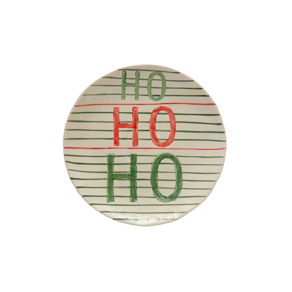 Hand-Painted Stoneware Plate w/ Stripes "Ho Ho Ho", Red & Green.Dimensions: 10" Round