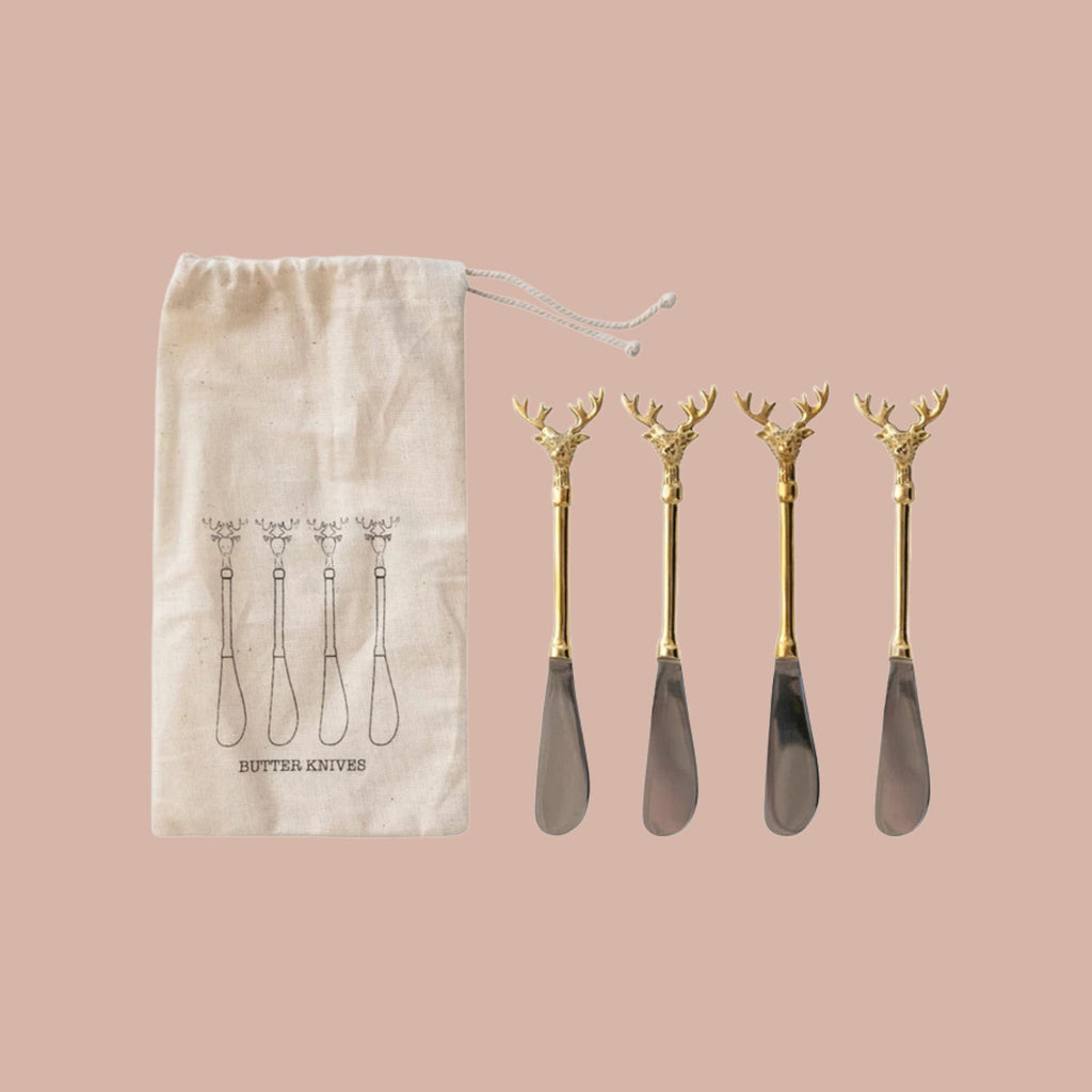 Stainless Steel & Brass Canape Knives w/ Gold Finish Reindeer Handles, Set of 4 in Printed Drawstring Bag.
