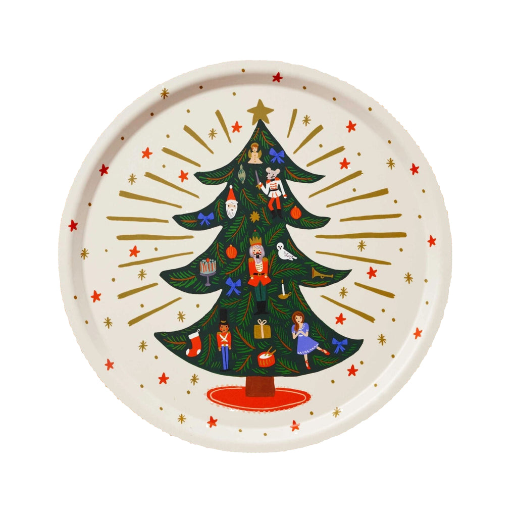 Rifle Paper Co.'s bent ply trays are as versatile as they are beautiful, handmade in Sweden from lightweight birch. The laminated finish makes them perfect for holiday entertaining or displaying your favorite festive décor. This round tray features the larger-than-life tree from the classic Nutcracker ballet along with a few of our favorite characters.