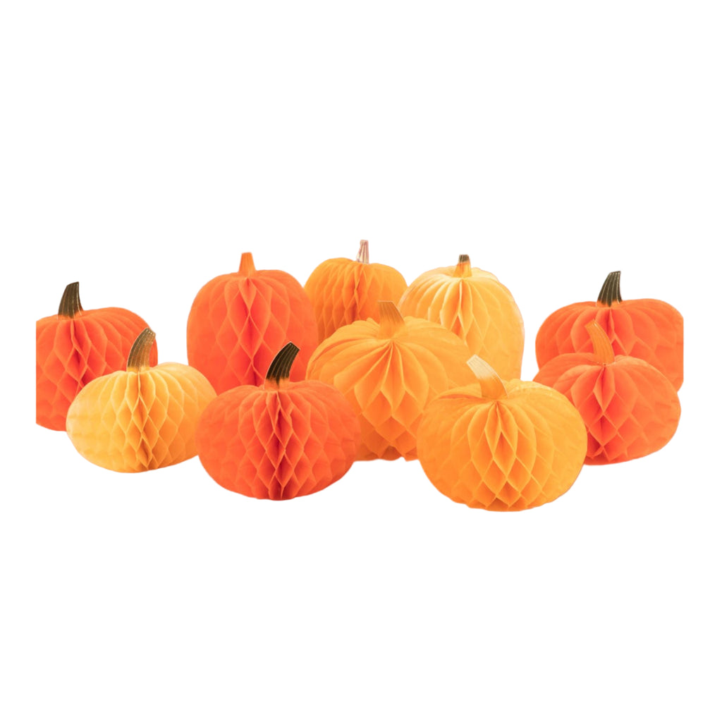 This fabulous set of decorative pumpkins will add a traditional look to your Halloween party. They are crafted from honeycomb tissue paper for a 3D effect. They can be used year after year too, no composting needed for these pumpkins!
