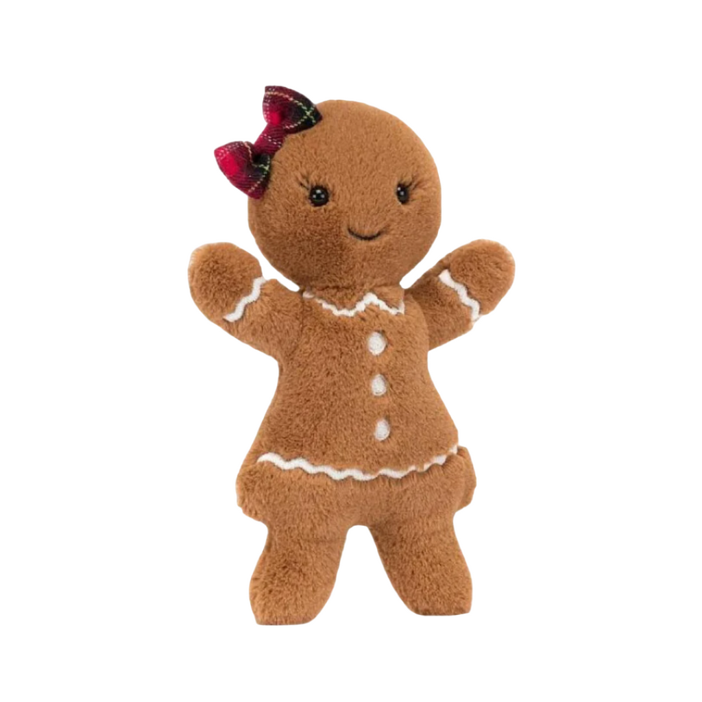 Jolly Gingerbread Ruby can't wait for Christmas! She's all glammed up in a stitched icing dress and her cosy fur is baked to perfection. With embroidered lashes and a tartan hair bow, and biscuit arms aloft, Ruby shines!