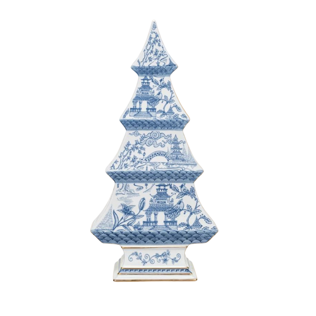 This blue and white ceramic tree with a pagoda pattern and gold electroplating is a beautiful and convenient way to decorate for the holidays. It features a ceramic tree with a blue and white pagoda pattern and a gold electroplated finish, creating a stylish and elegant effect.