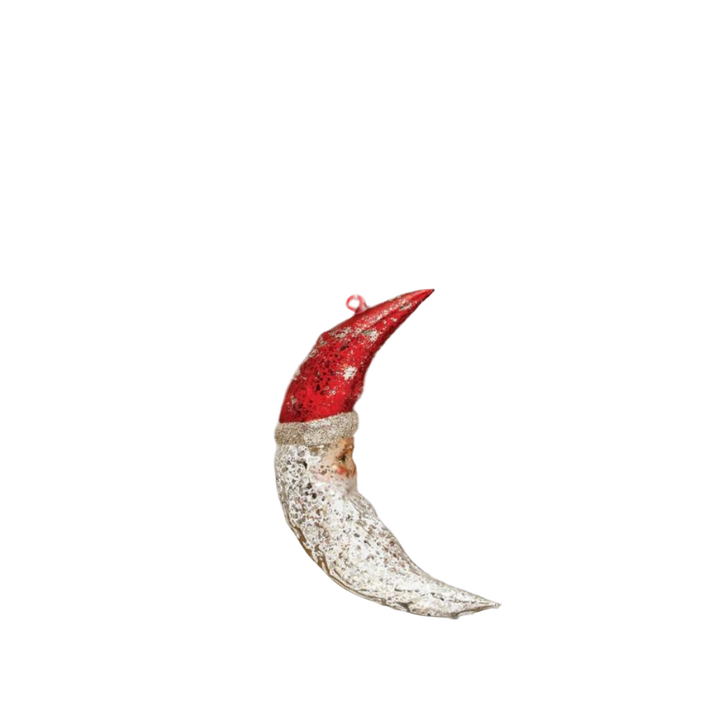 This charming mercury glass ornament features a silhouette of Santa Claus as a crescent moon with hand-painted details, finished with iridescent glitter. Ornaments can be showcased as decorations on a Christmas tree, wreath, or atop a festive centerpiece, hung from doorways, displayed on mantels, used to embellish cards and presents, or given as gifts.
