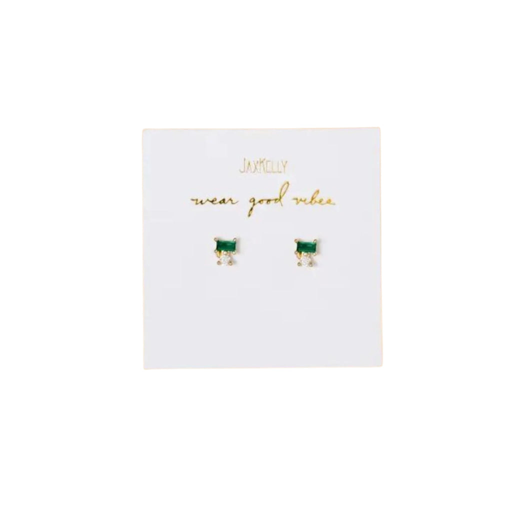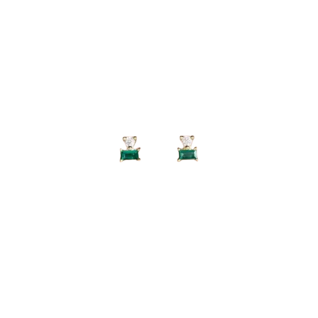 A singular emerald-colored baguette drops delicately down from a dainty circular set CZ. Wear these around the house or out with friends for a pop of color.