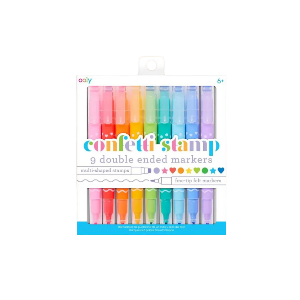 The Confetti Stamp Double-Ended Markers let you draw a pretty picture, and then throw yourself a party on the page. The fine felt tip gives you control over your strokes, while the stamp markers on the other end let you sprinkle confetti shaped stamps all over your artwork. Available in 9 sweet and playful colors, these stamp markers are great for cute art, decorating planner pages, homework, and any just-for-fun projects. Suitable for ages 6 and up. •